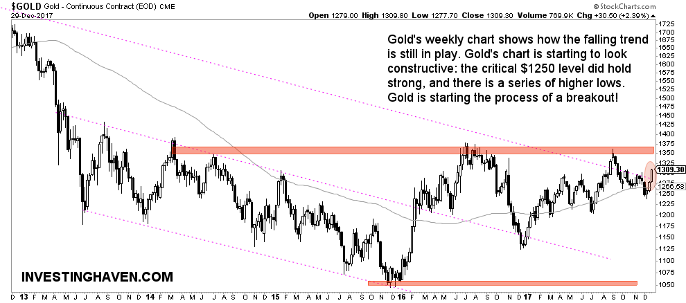 With that, gold’s price chart starts looking constructive. Note how it is today breaking out of its falling 7-year bear market trend. Note also this series of higher lows. This is not yet the real deal though, as said in our 2018 forecast a real bull market starts once gold crosess the $1350 to $1370 area. This is what we wrote: