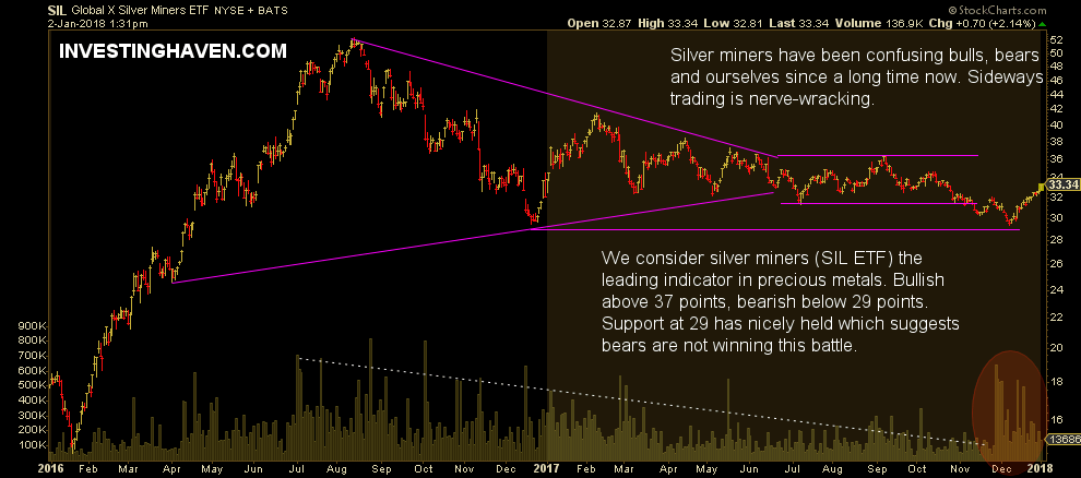 The possibility of gold to break out into a new secular uptrend in 2018 seems to be unlikely, at least according to us. The only thing we say about this: once the price of gold goes above $1375, and trades there for at least 3 consecutive weeks, we could be looking at a breakout scenario. In that case $1550 would be a price target.