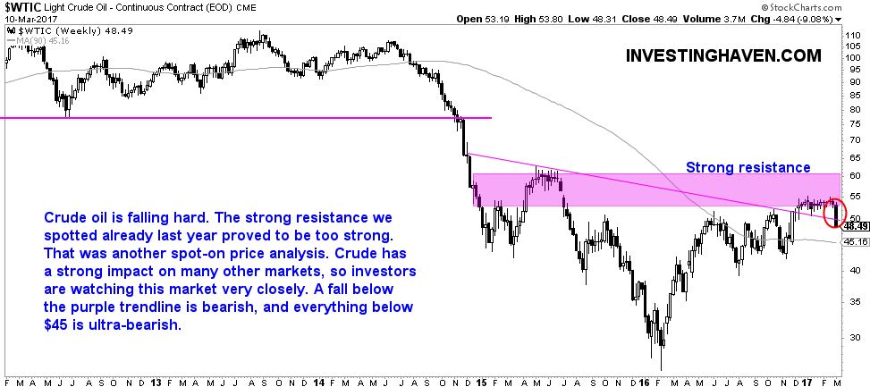 Crude oil was visibly not able to break through resistance. We spotted this resistance area last summer, and since then crude did not succeed in going structurally above $52 which is the lower area of the resistance area seen on below chart. Our 2017 crude oil price forecast was spot-on.