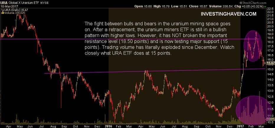 The uranium space is the only one refusing to break down, at least for now. The 15 points level in URA ETF, representing the uranium mining space, is by far the most important price level to watch. Note on the URA chart how trading volume has exploded as prices started rising last December. There was bullish momentum in the uranium space, the key question is whether bulls will win the battle, watch 15 points to get an answer on that question.