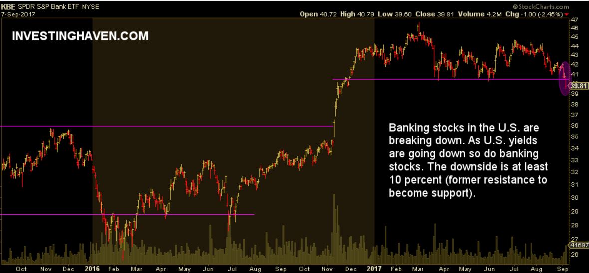 Banking stocks in the U.S. are breaking down. The leading indicator for banking stocks, KBE ETF, representing regional banks, is breaking through support. The finance sector, with regional banks in the lead, have been leading stock markets higher since last summer. After 12 months, that trend is coming to an end.