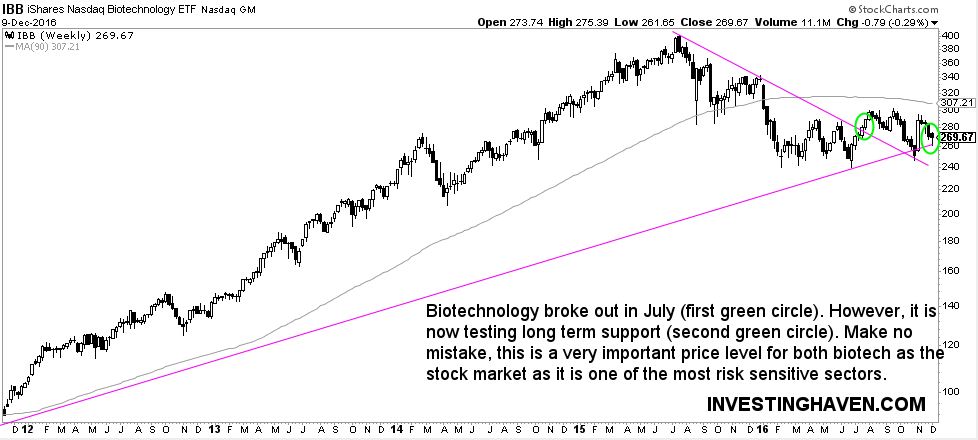 What the biotechnology stocks do is not only important for biotech investors, but also for all stock markets. Biotech, as part of the health sector, has been a leader in recent years. Markets typically rotate their leaders and laggards. But still health and biotech are risk sensitive so stock bulls do not want this sector to break down.