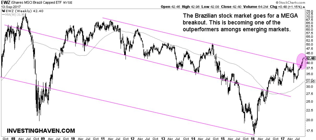 Right now, 5 months later, the Brazil stock market is not only trading higher than before the crash, it even breaks out in a very meaningful way. The chart below makes the point: the bear market channel is now invalidated.