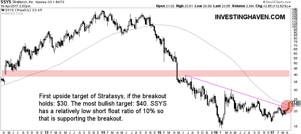 The breakout in Stratasys is visible both on the daily and weekly chart.