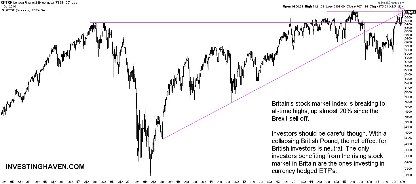 Now that the summer has ended, right at the start of the fall, we observe that the London stock index is breaking out to all-time highs. You read that correctly: the Brexit resulted in British stocks to outperform all other stock indexes, with a rise of more than 20% since the start of the summer.