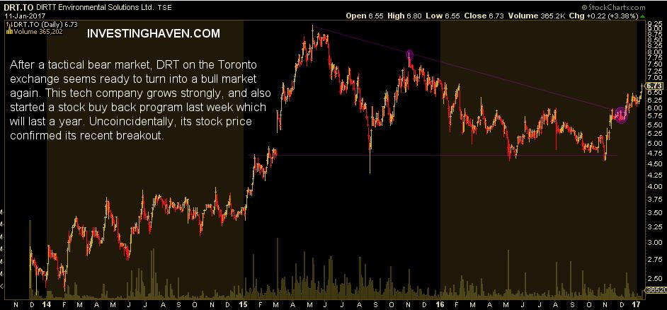 After a tactical bear market 1.5 year, DIRTT Environmental Solutions, trading on the Toronto Exchange, is now turning into a bull market. This tech company is growing very strongly. Moreover, it started a stock buy back program last week which will take a full year. Uncoincidentally, its stock price confirmed its recent breakout.