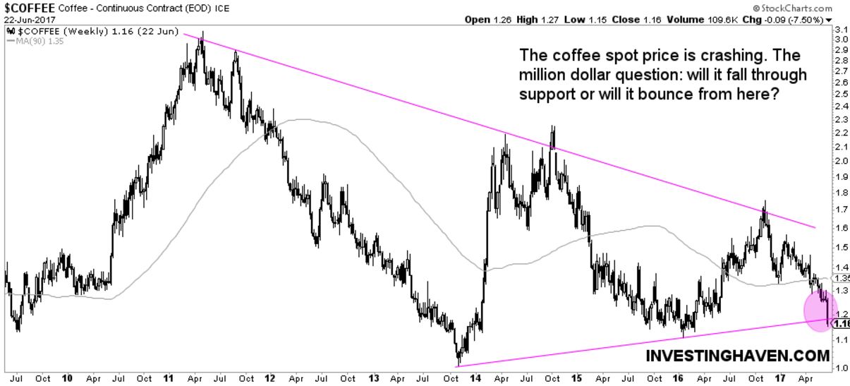 The price of coffee is crashing, strongly. Investors will refer to it as the coffee price crash of 2017. How to play it, and what’s next, are the questions top of mind of investors.