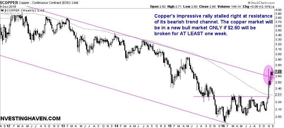- The copper price rallied strongly in October and November, but stalled right resistance of a long term bearish trend channel.