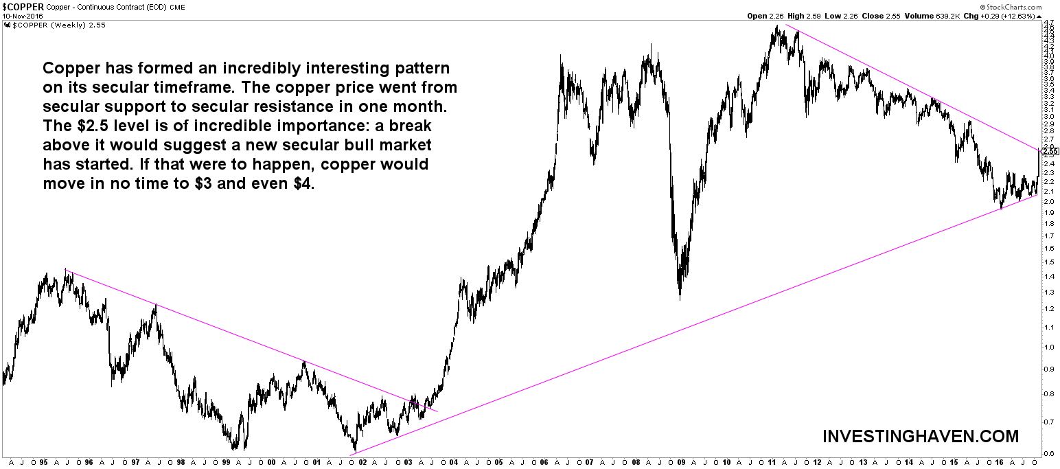 A sustained break out above $2.6 (which means that the copper price would trade at least a week above that price point would suggest a new secular bull market has started, indeed ‘under the radar’ which makes it incredibly attractive.