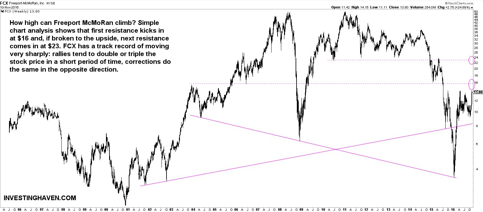 The easiest way to play a copper secular bull market is to invest in one of the major copper miners. Our preference goes to Freeport McMoran, symbol FCX, with a market cap of $18B. FCX can easily move to $16 from here, which is a rise of 15% . The real resistance level kicks in at $23 which is 72% below today’s price level. If (that’s a big IF) copper breaks out, then we would see $23 in FCX in 2017, without any doubt. It is a matter of days until the market will reveal the first signs of that scenario playing out or not.