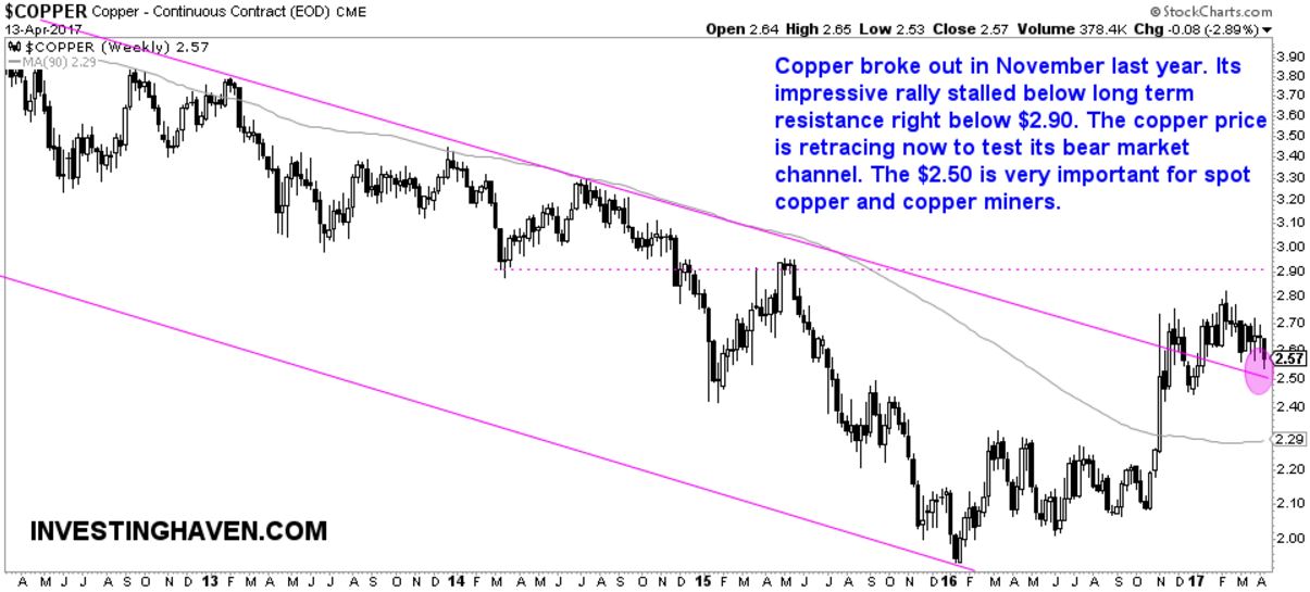 In other words, if the price of copper breaks below $2.50, it goes back in its bear market channel, in which case its tactical bull market would end.