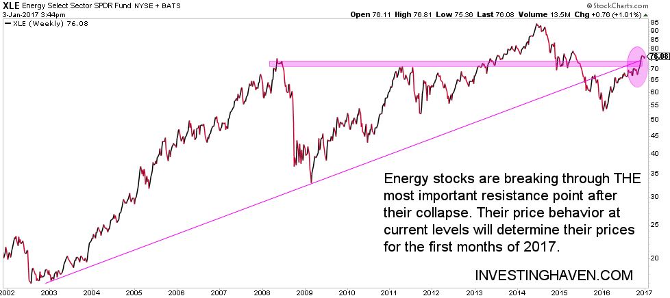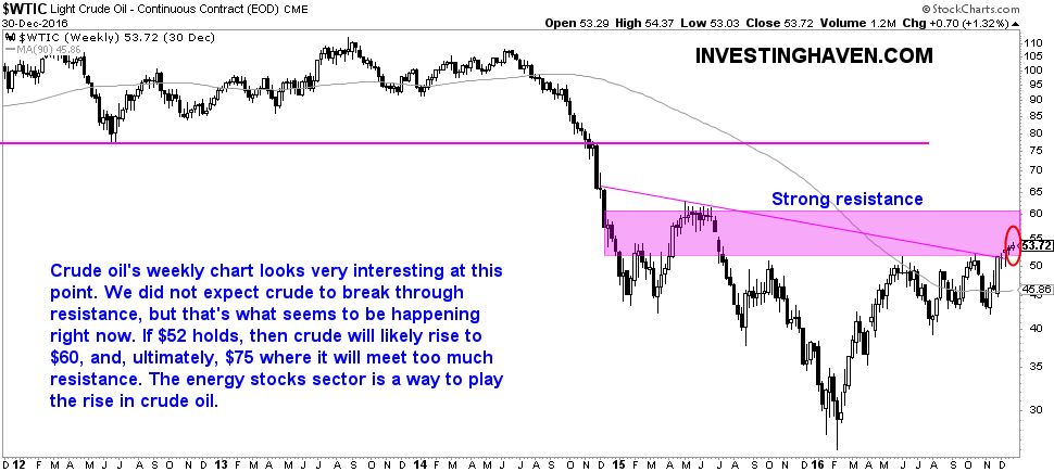 We said in our crude oil price forecast that there was a potentially bullish scenario in 2017. “Prices could certainly move higher, but will find secular resistance at $75 where the 2014 gap down started” was what we wrote a while back. Energy stocks got a strong boost early last year, and after Trump’s victory. But will crude oil continue its rise, and are energy stocks a good play to ride a rising oil trend?