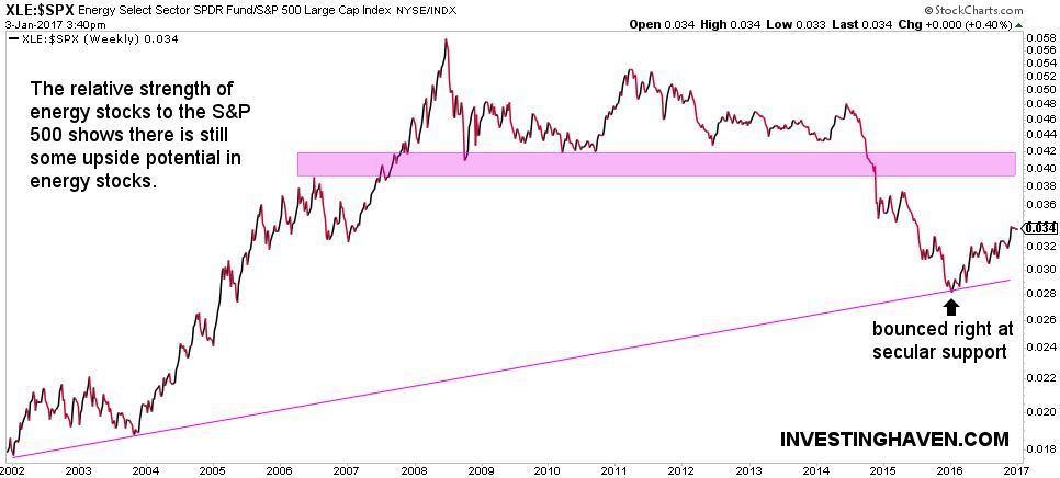 We said in our crude oil price forecast that there was a potentially bullish scenario in 2017. “Prices could certainly move higher, but will find secular resistance at $75 where the 2014 gap down started” was what we wrote a while back. Energy stocks got a strong boost early last year, and after Trump’s victory. But will crude oil continue its rise, and are energy stocks a good play to ride a rising oil trend?