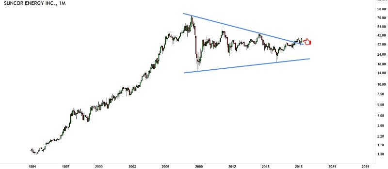 Suncor has an interesting price chart. It has never experienced a big hiccup since 1994, until the 2008 global financial crisis halted its exponential price movement. It has the fastest recovery amongst all its peers, it needed only 5 months to bottom! Subsequently price has been consolidating into a symmetrical triangle. Price broke the upper triangle trendline in Sept 2017 but swiftly retraced to test the strength of support. So far it has been holding well, and is poised to go higher. Conservatively, we anticipate price to challenge 43 and 48 by end of 2019. Whether or not this will materialize, getting back to 73 will be hard. The bearish scenario will play out once price breaks below the upper triangle line.