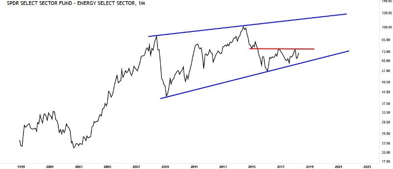 Since the top in 2007 price has been moving in a somewhat upward tilting pennant for 11 years. After finding support for the third time at the lower blue trendline this stock is poised to drift higher. As long as the price doesn’t break below the lower blue trendline we will remain neutral with a bullish bias in which case XOM will likely challenge 105.