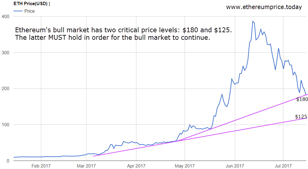 The answer to that question is very simple: Ethereum’s price must hold $180 and, ultimately, $125 in order to continue to be in its long term bull market.