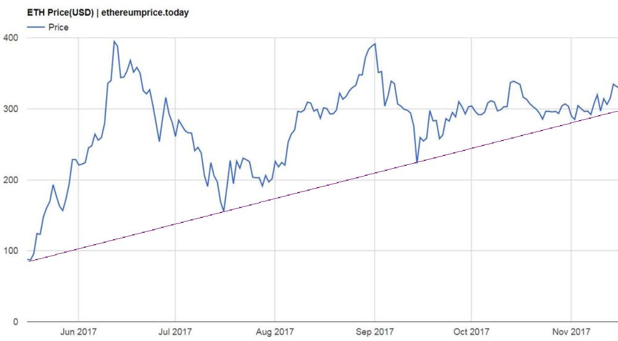 The price of Ethereum has stabilized in recent weeks after Ethereum crashed in September. Since Ethereum recovered mid-September it has been trading in a narrow range between $280 and $330.