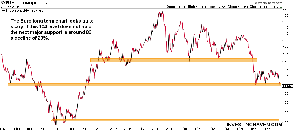 It is a bit too early to say what exactly will happen, but given the very strong dollar setup, the not so constructive setup of the Euro, and the money creation machine in the European HQ of the ECB, we believe there is a very fair chance that the Euro will break down in 2017.