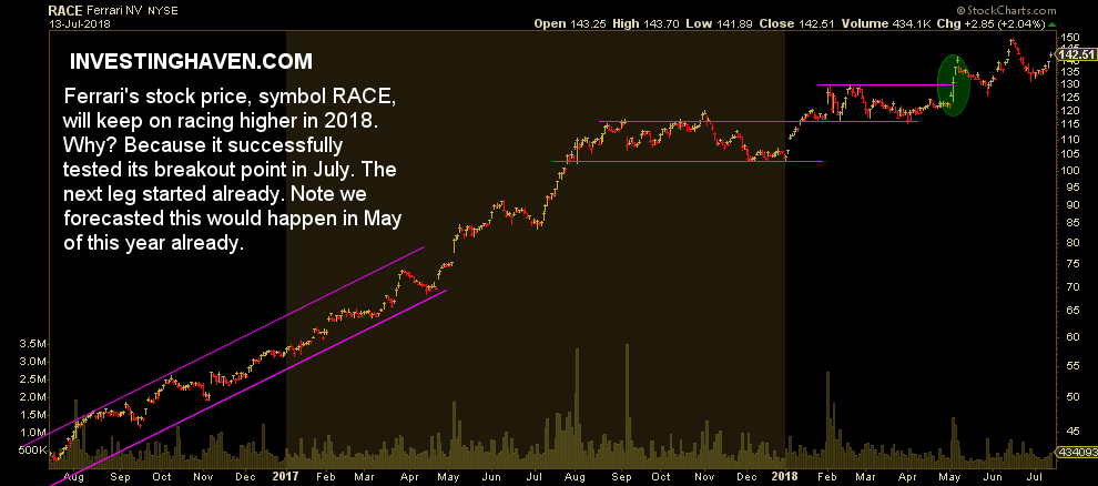 Ferrari is not only an amazing car it also has a gorgeous stock chart. Its stock symbol is RACE. We provided coverage earlier this year when we wrote This Is Why Ferrari’s Stock Is A Buy In 2018, Will Continue Its Race Higher. In the meantime we see a confirmation on Ferrari’s stock chart that its stock price will contineu to race higher this year.