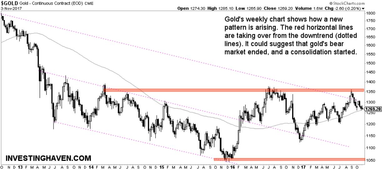 Gold has confused both bulls and bears this year, and that was our main theme this year. If such a pattern continues for a longer period of time, which it did throughout this year, it simply indicates a sideways trend, and that is a consolidation. That sideways trend could continue in 2018, but there is also a risk of a breakdown in gold as 2018 kicks off.