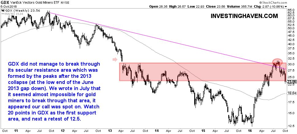 Our viewpoint is simple: gold mining stocks are breaking down, and have much more downside potential in the coming months. Gold mining stocks are a SELL in 2017. Our standpoint is based on supply/demand in the market, reflectd in the chart pattern. As shown below, the current chart setup is very destructive. After a unsuccessful attempt to break through secular resistance, it became clear that the gold mining stock sector was hugely overbought.