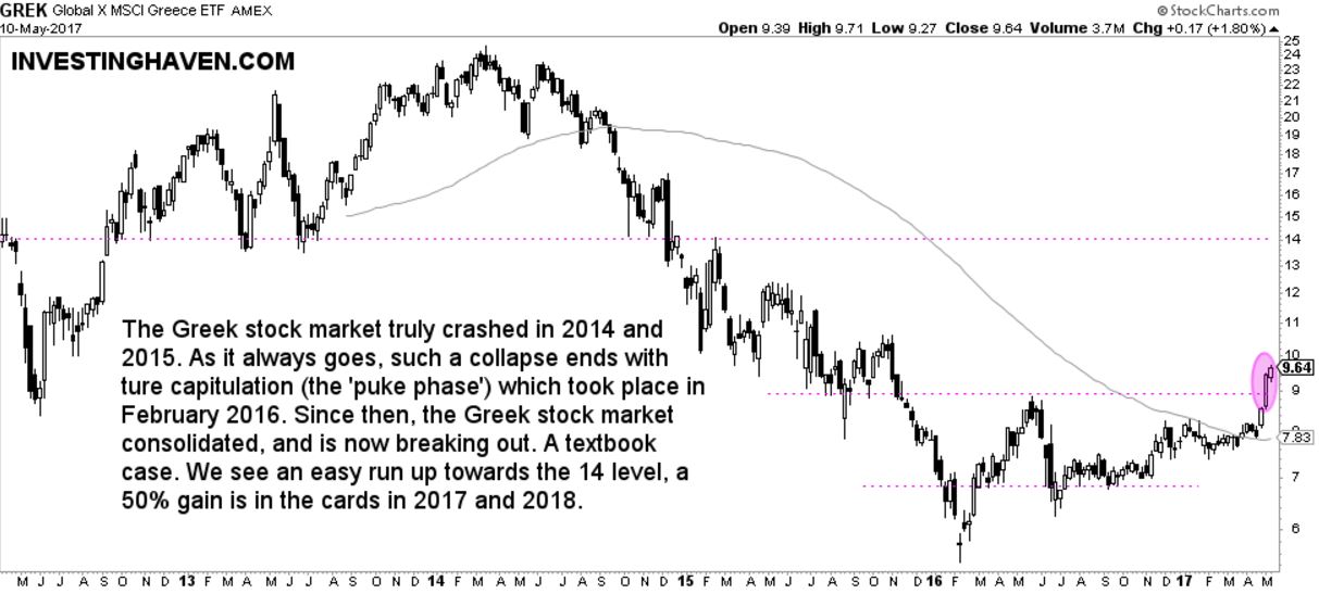 The Greek stock market chart has a textbook setup: the collapse is followed by capitulation (February last year) and then a long term consolidation period. It is wise to buy the breakout after the consolidation, as that’s the highest risk/reward setup for investors.