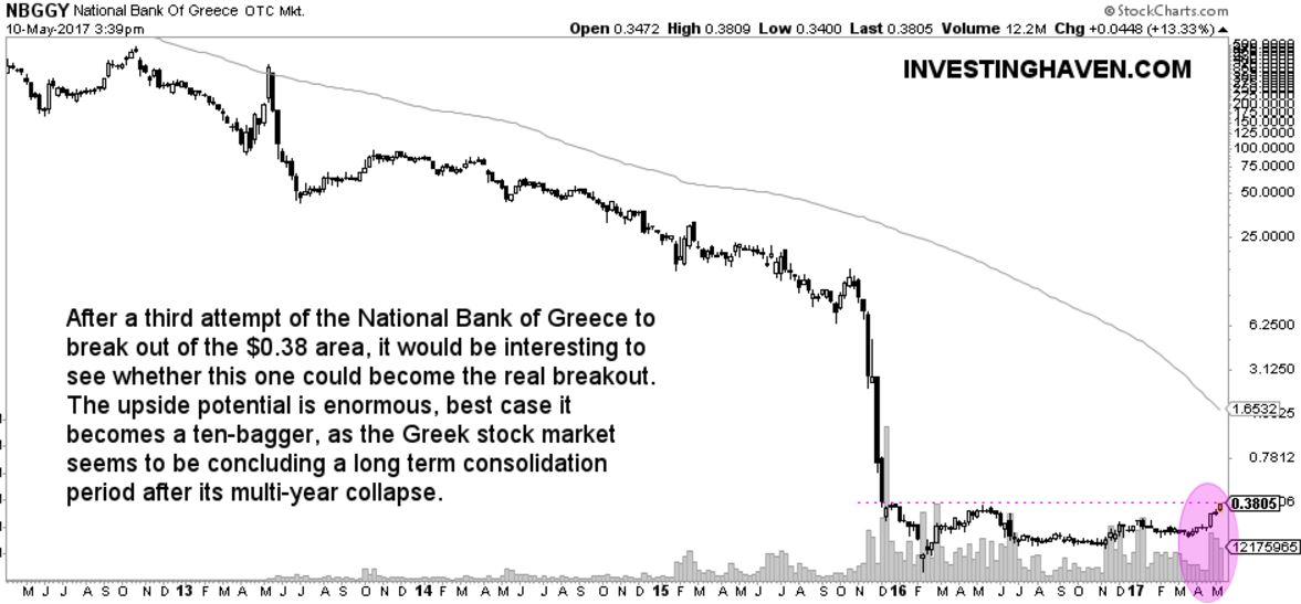 If the Greek stock index looks good, then the National Bank of Greece looks awesome. Watch the breakout attempt on the following chart. This setup, if the breakout would take place, could provide multi-bagger potential.