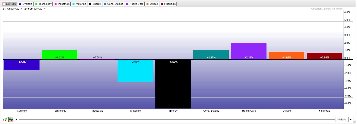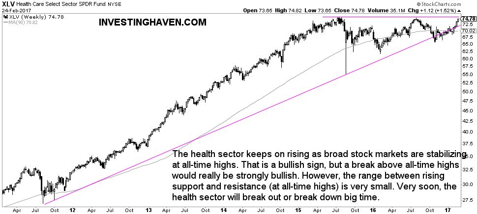 The health care stock market sector is the outperforming sector in the S&P 500 in February 2017. Though this is an interesting insight for investors, the more important observation is the chart setup of the health sector (which is discussed in more detail in this article).