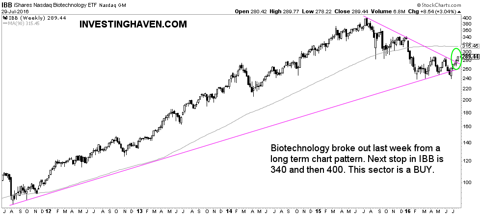However, the ‘real deal’ is the biotech sector. Last week, it engaged in a huge breakout, one that will have lasting implications. Biotech was suffering strongly in 2016. The long term chart pattern (triangle) has now resolved to the upside, as shown on the IBB chart (representing the biotech sector).