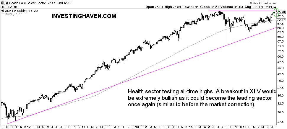 As seen on the first chart, the health sector, represented by XLV, is testing all-time highs in 2016. That is major news as the sector has respected support last year (see trendline) and is now close to breaking out.