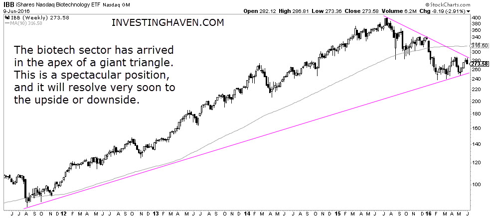 Altough the health sector looks impressively good, the biotechnology sector is really sensational. Biotech has established a long term triangle pattern, and the apex is closing down, as seen on the next chart. We will see a break out or break down very soon. As this pattern is in the making for a long time, the break will be impressive and aggressive.