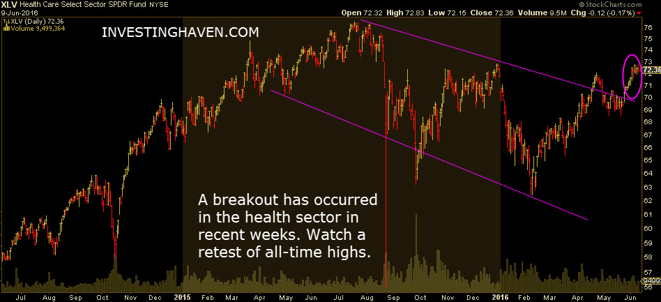 This is important news as the health sector tends to lead stock markets. We can easily conclude that a breakout in the health care sector is a leading indicator for U.S. stocks in general.