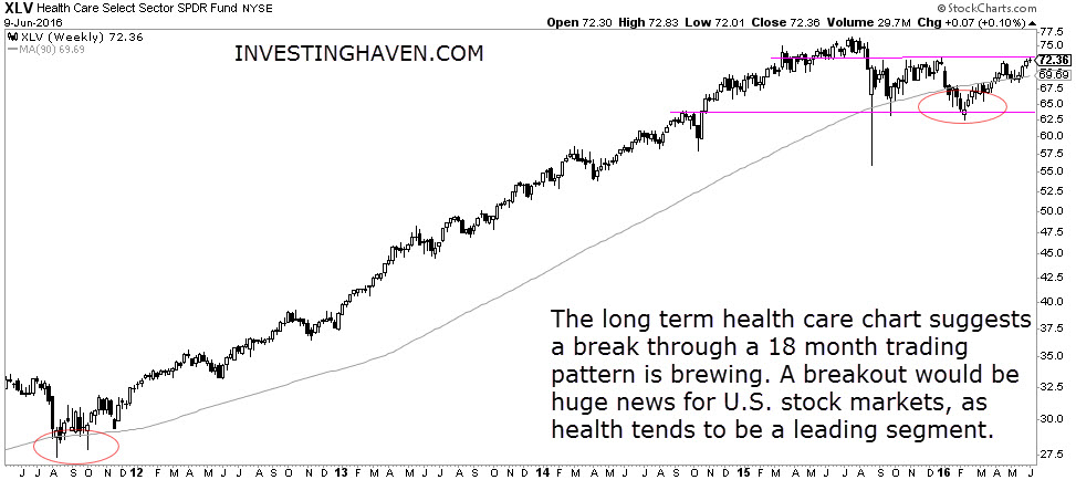 On the longer term chart, see below, the picture looks even more impressive. A long term trading range is about to be broken to the upside. The weekly chart shows how health care stocks went through an impressive uptrend since 2012, followed by a consolidation since 2015. It seems that the consolidation phase is coming to an end now.