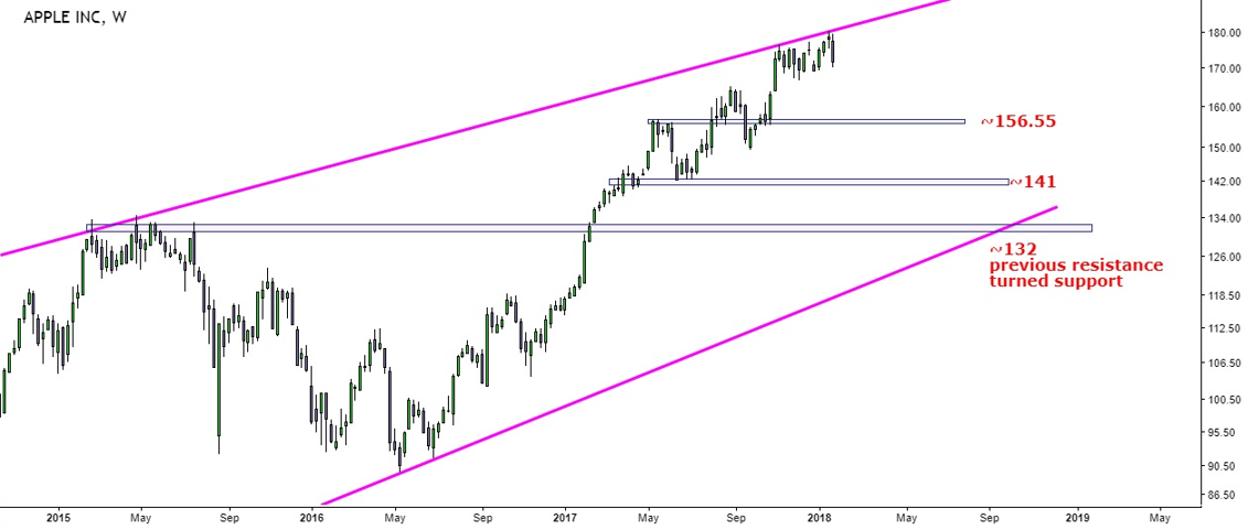 Exactly 3 months ago, when our report on Apple (NASDAQ: AAPL) was published on 3rd Feb, our short term outlook was bearish and the market went through a quick and aggressive correction that made Apple’s stock price tumble as well. We were spot-on forecasting the first level of support at ~ 156.55.