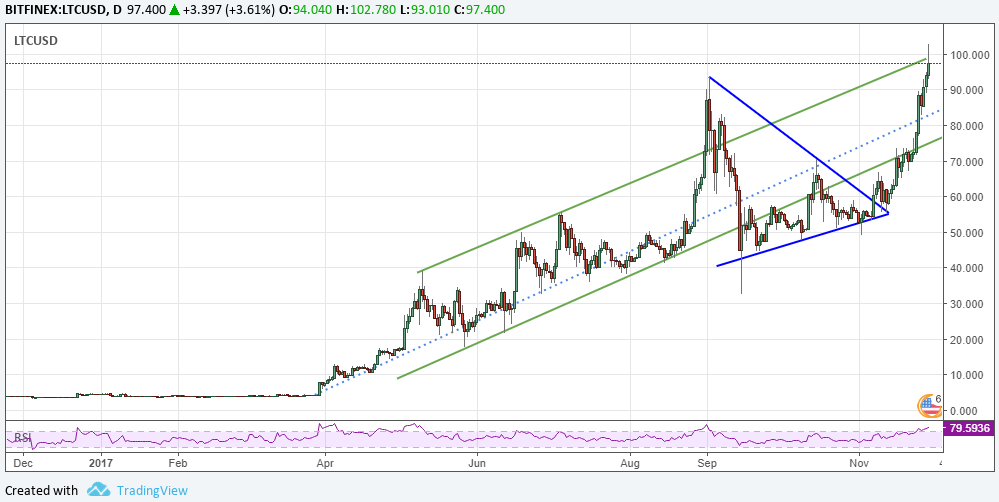In October, as media was calling the end of the “Crypto Bubble”, we said that our Litecoin was still bullish. And it was. Here we are today, meeting the 100 USD forecast even before the end of 2017. So Congratulations to all of our readers who banked on these calls!