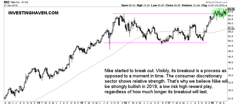 Nike (NKE) is becoming a textbook example of a breath taking breakout process, a strong fight between bulls and bears. Early 2018 we identified Nike as a great stock to buy in 2018. It was trading at $67 back then. As it only trades $2 higher today, at the time of writing, it is worth asking the question whether our call was right or wrong. Time to follow up on our buy signal on Nike, and confirm whether Nike as a stock is still worth consider to buy in 2018.