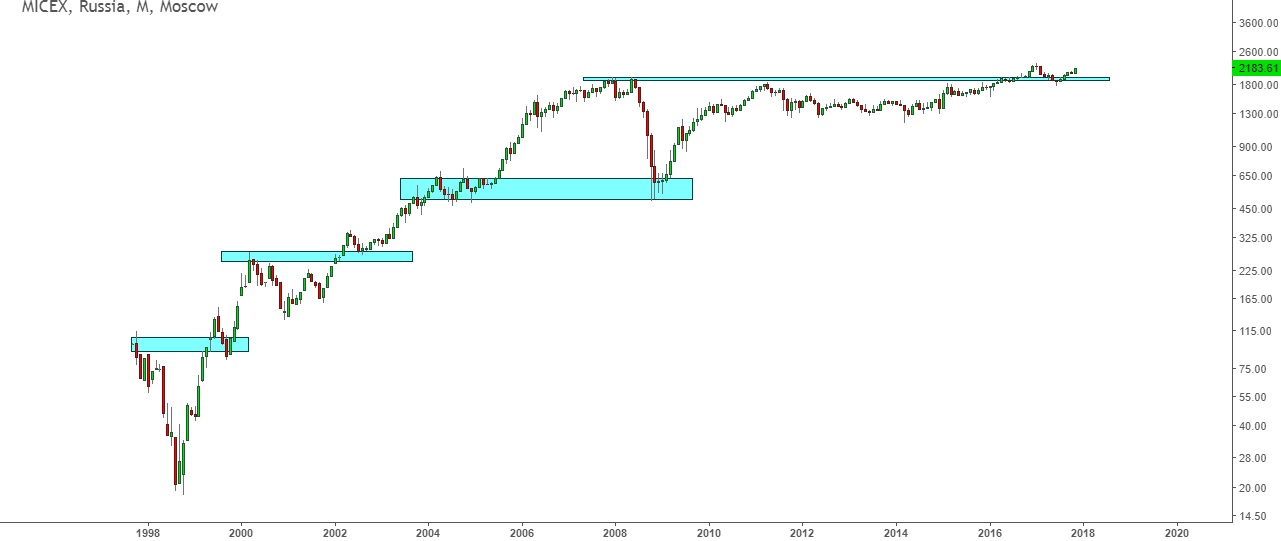 Below is the monthly historical chart since 1997 of the MICEX stock market index.