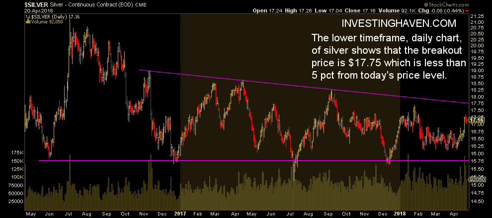 The daily chart gives additional insights. First, the ongoing consolidation with strong support is visible. More importantly, however, is the fact that silver is just 5 pct away from the breakout point which is the same one as on the longer term chart.