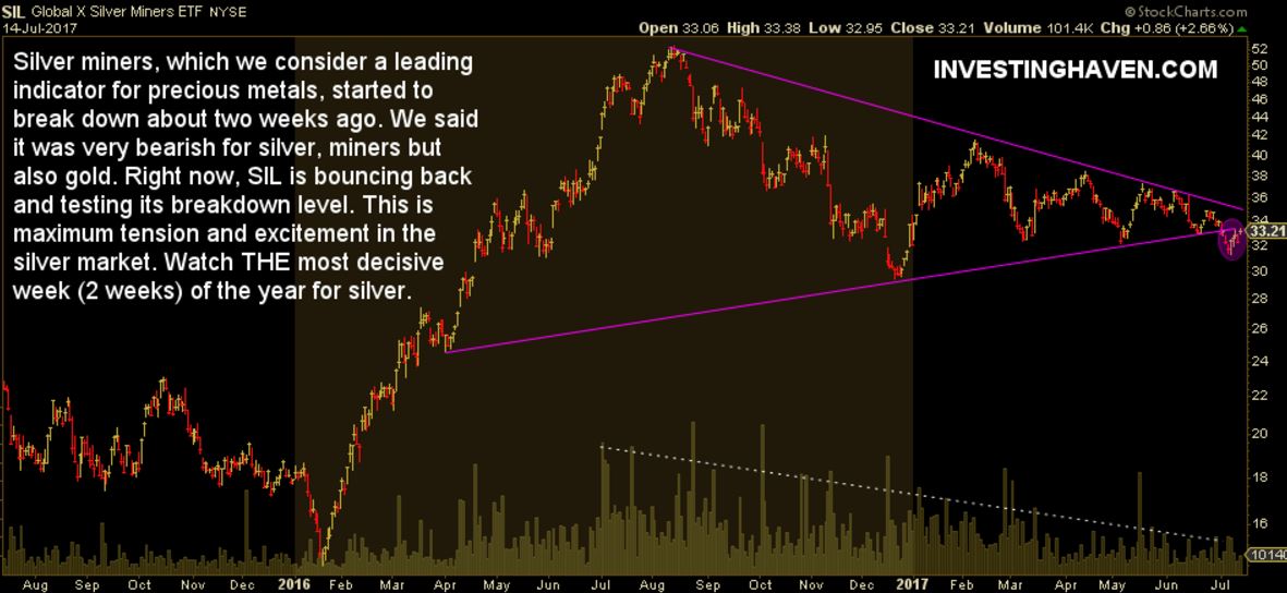 Silver miners (SIL) have been acting as a leading indicator for the precious metals segment. InvestingHaven’s research has identified SIL (silver miners ETF) as an incredibly accurate chart which shows a pattern representative for gold, silver and miners. See the chart and the ‘pixel perfect’ triangle pattern below.