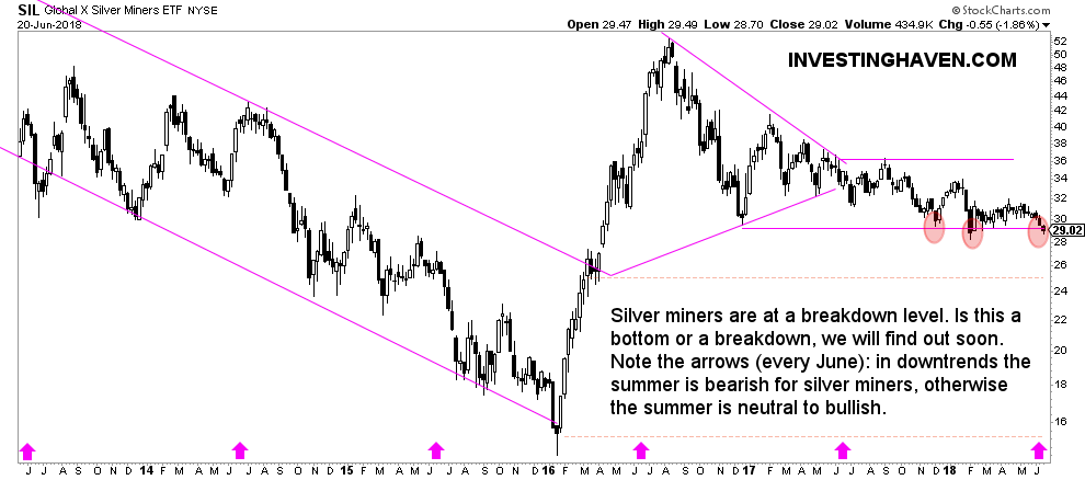 Looking at the latest evolution on the silver miners chart it is interesting to see how the flat pattern is being ‘tested’ right now. The SIL ETF representing the silver miners sector trades at 29 points now. So far, in the last 9 months, this level has been ‘tested’ twice, and it hs held strongly. This increases the importance of this particular price point. Smart investors are watching this level closely, very closely.