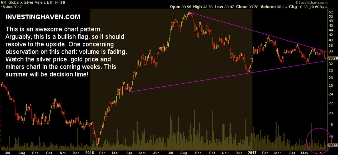 When it comes to silver miners we spotted an awesome chart setup two weeks ago. We said it was a matter of weeks until the silver miners would resolve itself in a strong bullish or bearish trend. We still believe so as evidenced by the silver miners chart included below.