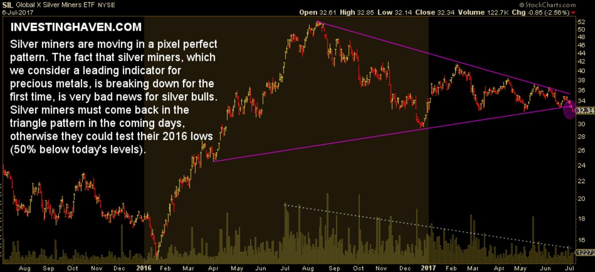 The fact that silver miners are breaking down is an extremely important event because we consider them a leading indicator for the precious metals space. The proof is in the ‘pixel perfect’ pattern they have been moving into since early last year.