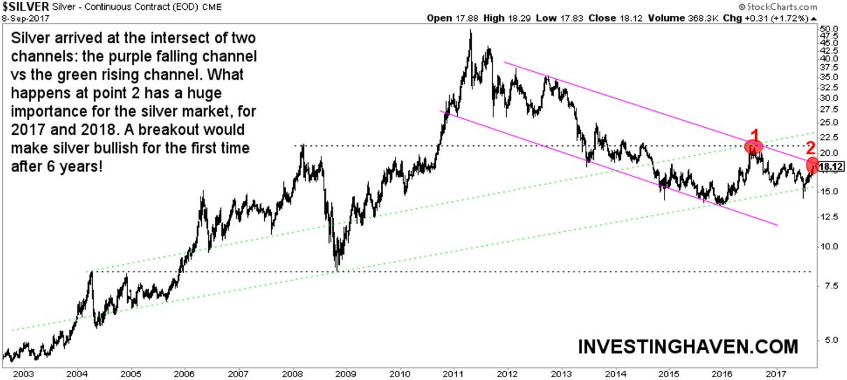 On the one hand it is silver’s price chart that shows a very interesting pattern. Point 2 on the chart is where are now. It is clear that silver trades at the intersect of a falling (purple) and rising (green) channel. Once the price of silver goes decisively above $18.80 it will move out of the falling (purple) channel. The rising (green) channel will be the key driver. Needless to say, in such a scenario silver will most likely move higher within that channel.