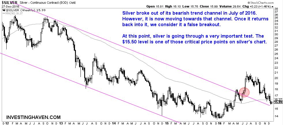 The coming days and weeks will be the ultimate test for silver. Any break below $15.50 will bring silver back in its falling channel. That would be extremely bad news for silver bulls.