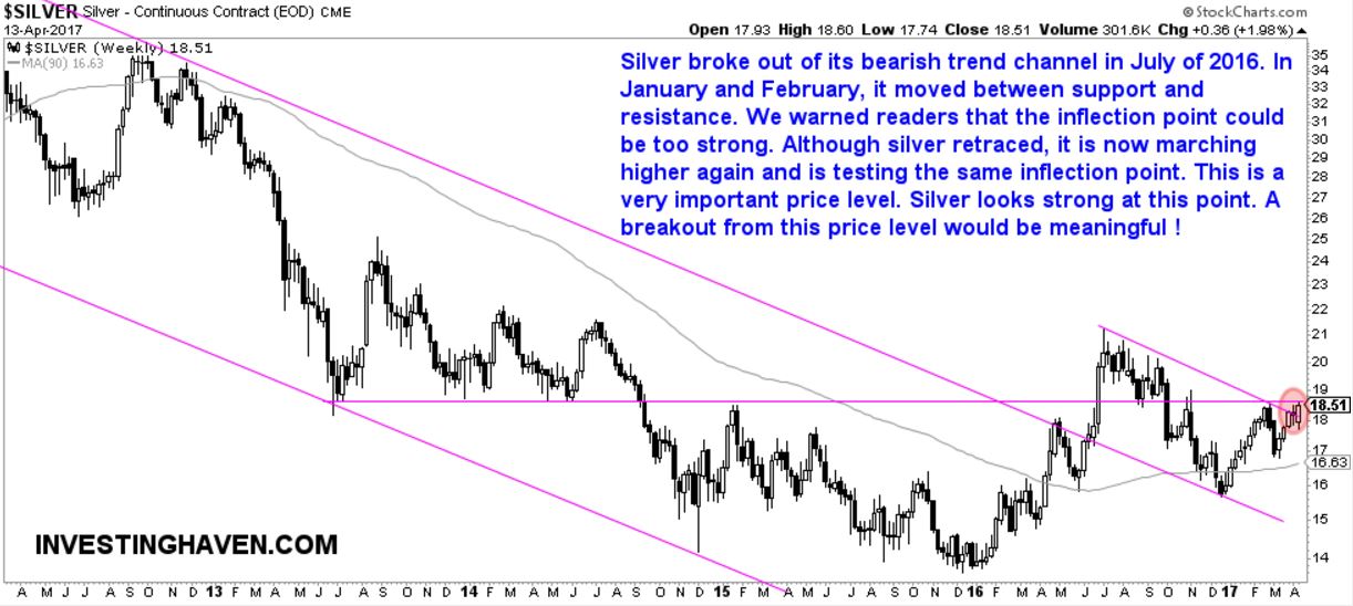 The price of silver successfully tested support in January, only to find strong resistance at $19 in March. That is when we became bearish and saw silver going back to $15 or lower. Slightly later, we observed that March 2017 would be a decisive month for the price of silver. Indeed, silver went higher in March and April, a more bullish development than we expected.