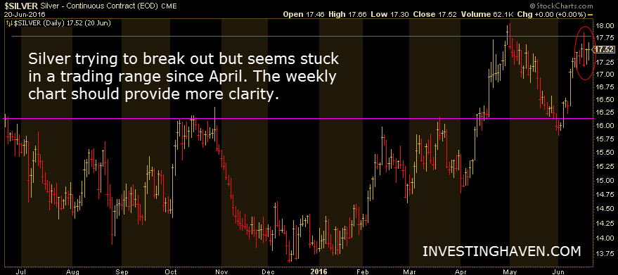 Silver has tested the breakout area but was unable to break through it. With a sharp intraday reversal on Thursday June 16th 2016, setting a lower high, there is nothing particularly bullish about this price at this point in time.
