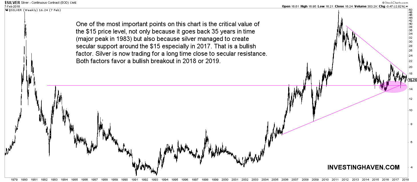 Essentially it is key for investors to monitor closely markets are close to a secular breakout or breakdown. Silver, in particular, is moving in a narrowing area between $15 and $18 which is just a 20 percent range. Sooner rather than later silver’s resistance or support has to break which will result in a continuation of the 7-year bear market or the start of a new bull market.