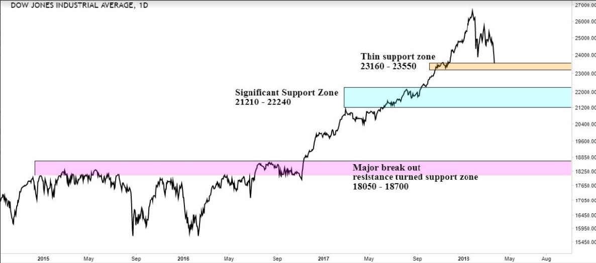 The daily Dow Jones Industrial Average (DJIA) line chart shows that the DJIA index is going towards the thin support zone of 23160 – 23550 for sure within the next 2 weeks. We feel that this thin zone has a large chance of being pierced through a’though the latest news has top officials from USA and China agreeing to communicate on trade issue.