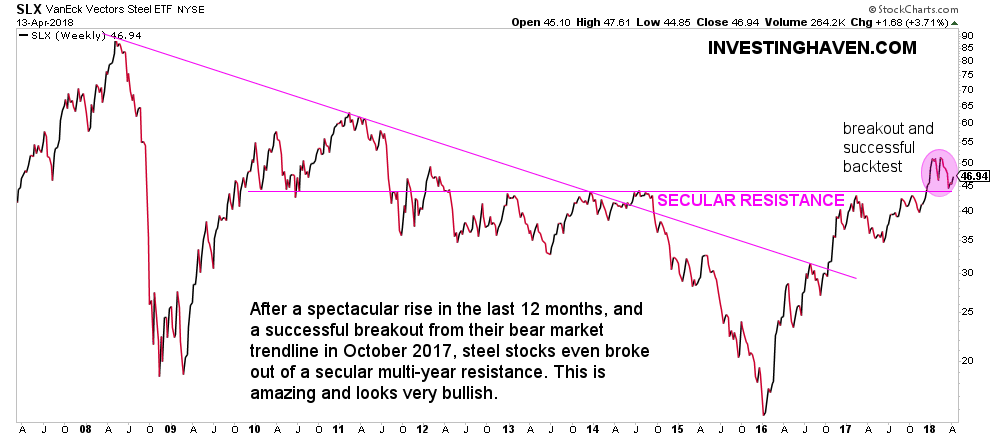 We noticed a clear breakout, 3 months ago, and reported this in Steel Stocks In Major Bull Market As They Break Through Secular Resistance. This is how we concluded the steel stocks chart: “Right now steel stocks show a clear breakout. Visibly, there is much more upside potential.”
