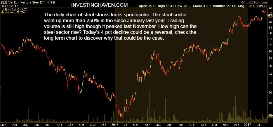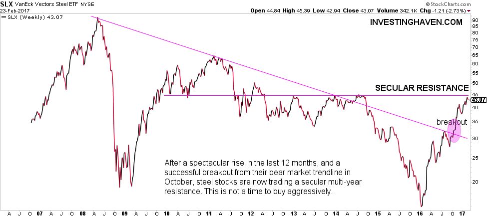 It really is no coincidence that the impressive rally of steel stocks stalled right at 45 points. The long term chart reveals that 45 was STRONG resistance between 2012 and 2014. In 2015, resistance appeared to be so strong that steel stocks fell sharply. No surprise they cannot break out from that resistance level at their first attempt.